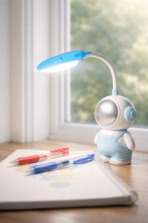 چراغ مطالعه فانتزی مدل فضانورد کودک، با طراحی جذاب و دوستداشتنی، انتخابی مناسب برای میز تحریر کودکان و نوجوانان است. این مدل دارای سیم متصل به برق بوده و بهصورت مستقیم با اتصال به برق شهری قابل استفاده میباشد؛ بنابراین بدون نیاز به باتری، بهراحتی و بهصورت مداوم روشن میشود.