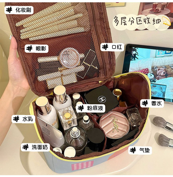کیف آرایش چندطبقه و جادار با طراحی کاربردی، مناسب برای نظمدهی کامل لوازم آرایشی در خانه و سفر. داخل کیف دارای بخشبندی مجزا برای قرار دادن کرمها، عطر، پنکک، رژلب و سایر لوازم است تا همه چیز مرتب و در دسترس باشد.